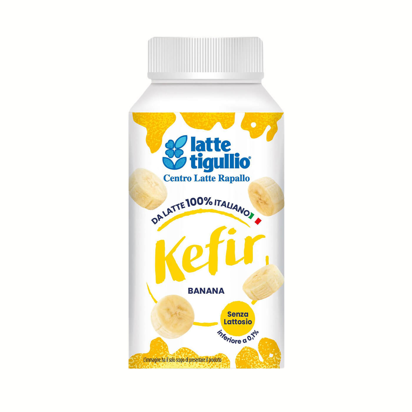 | Ingredienti | Kefir da LATTE senza lattosio con fermenti lattici vivi (con Bifidobacterium, Lactobacillus acidophilus, Lactobacillus delbrueckii subsp. Bulgaricus, Streptococcus thermophilus, Lactococcus lactis subsp. Cremoris, Lactococcus lactis subsp. Lactis), preparazione di frutta 14% (zucchero; banana 35%; sciroppo di glucosio-fruttosio; stabilizzanti: amido modificato, pectina; aromi). Senza glutine. Senza conservanti. Il prodotto contiene glucosio e galattosio in conseguenza della scissione del lattosio. |
